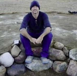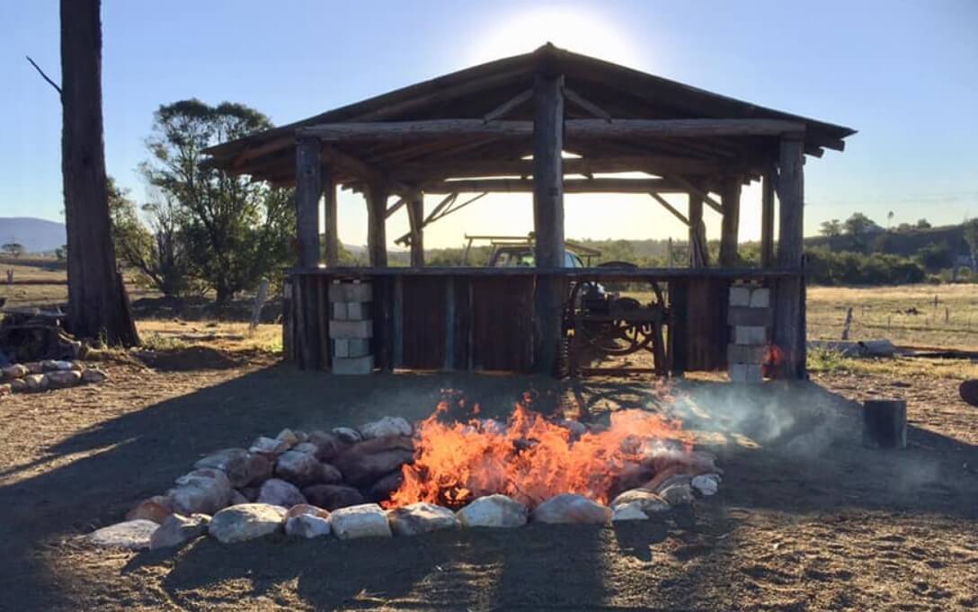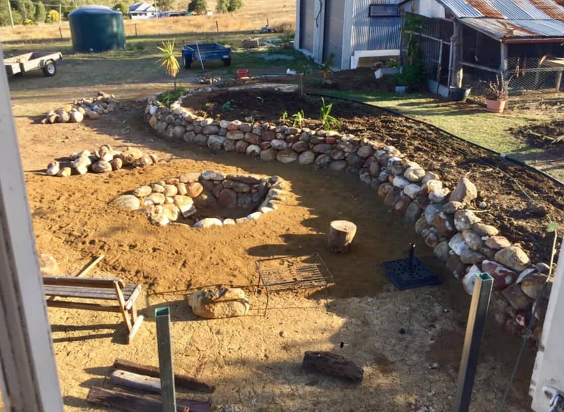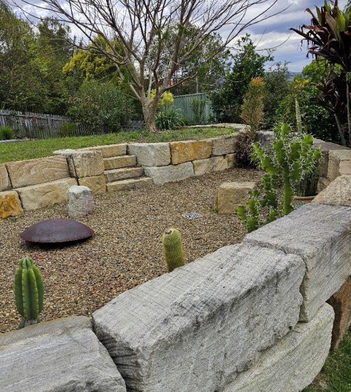 Round stone fire pit with natural fieldstone construction and surrounding seating