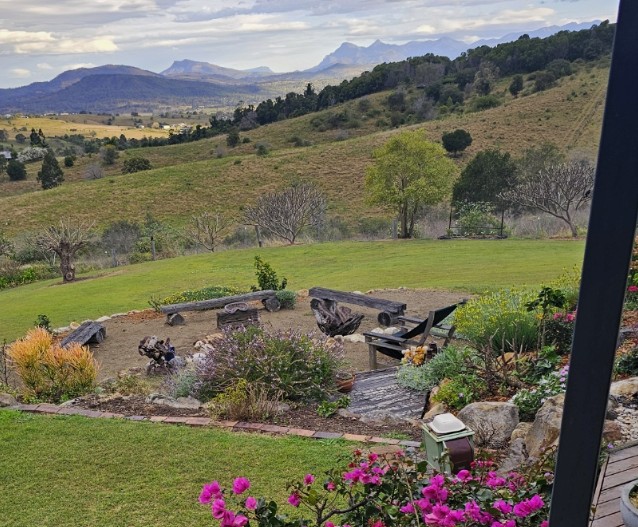 Steel fire bowl in huge sunken area surrounded with plantings.