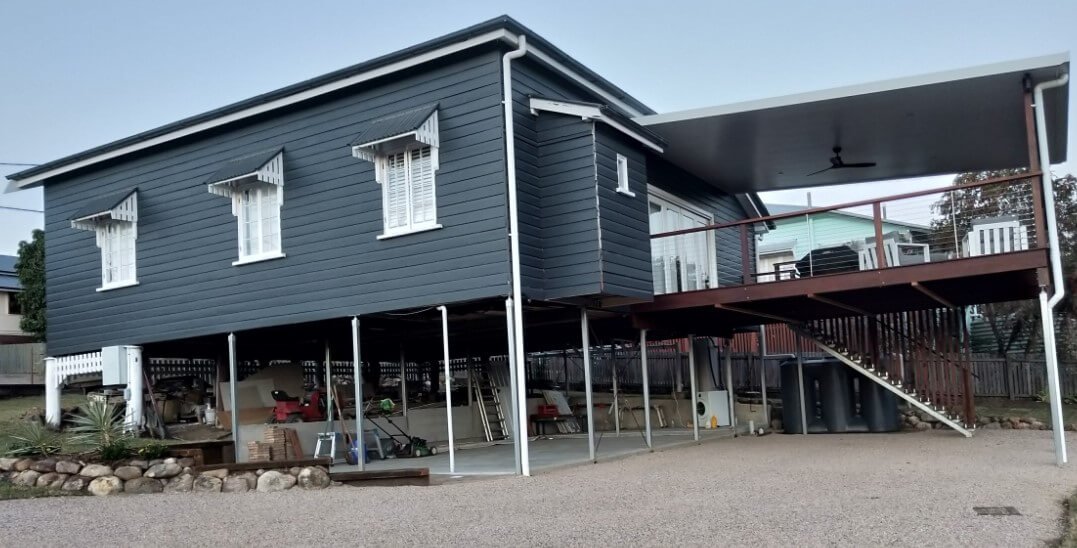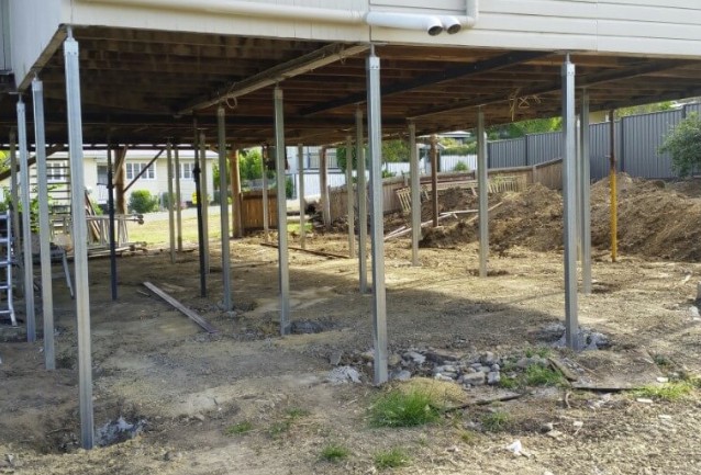 Complete restumping of a 1920s Queenslander home using adjustable steel stumps.